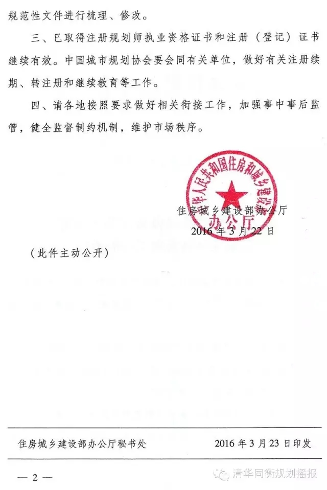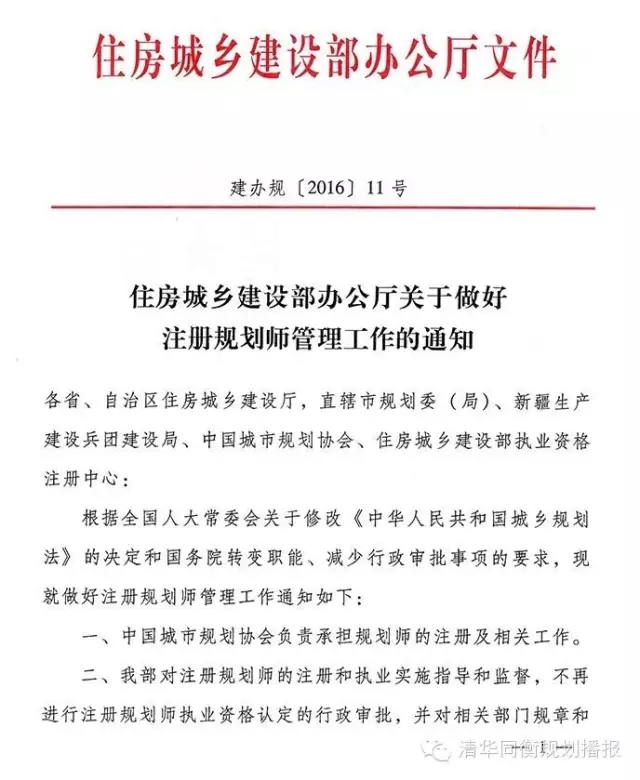 同时发布《住房城乡建设部办公厅关于做好注册规划师管理工作的通知》,通知指出,今后将由中国城市规划协会负责承担规划师的注册及相关工作,住建部对注册规划师的注册和执业实施指导和监督,不再进行注册规划师执业资格认定的行政审批。