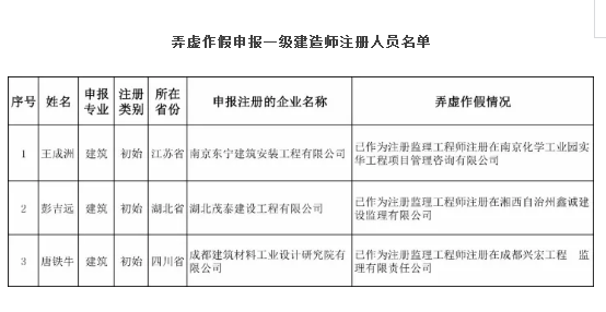 9月28日,住建部对王成洲等3人申报一级建造师注册弄虚作假行为给予通报批评,一年内不受理其注册申请,并将其不良行为在全国建筑市场监管公共服务平台上予以公布。(弄虚作假人员名单见文后)